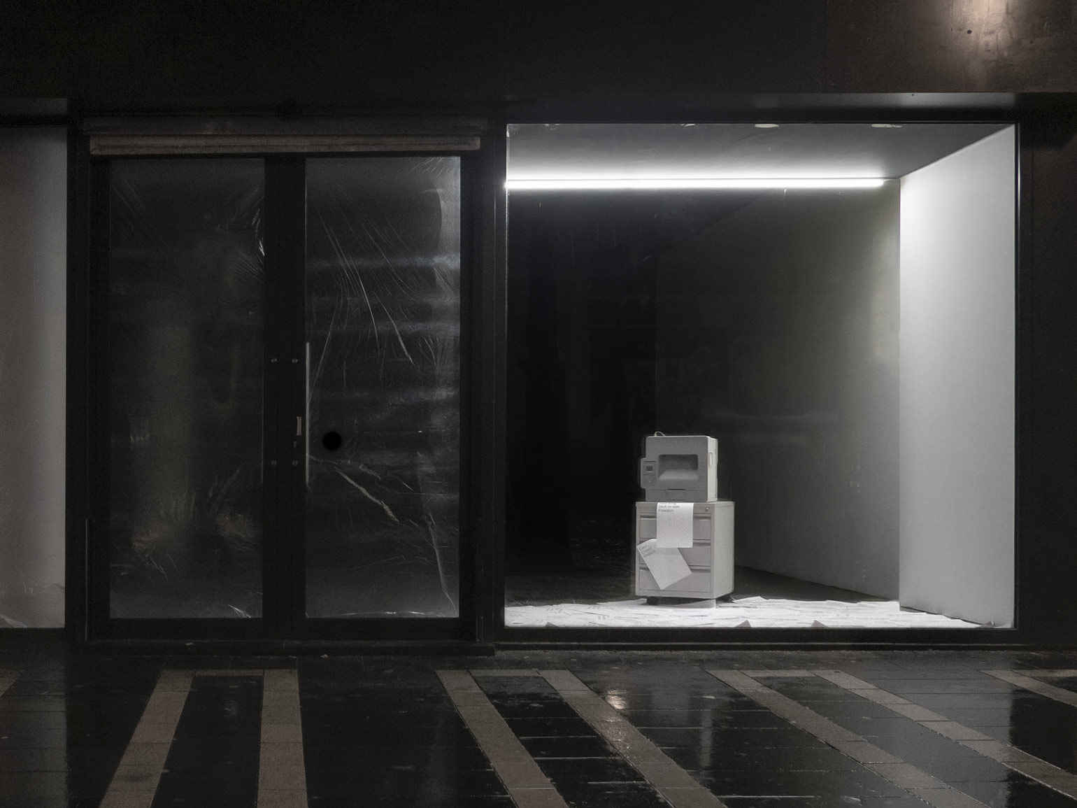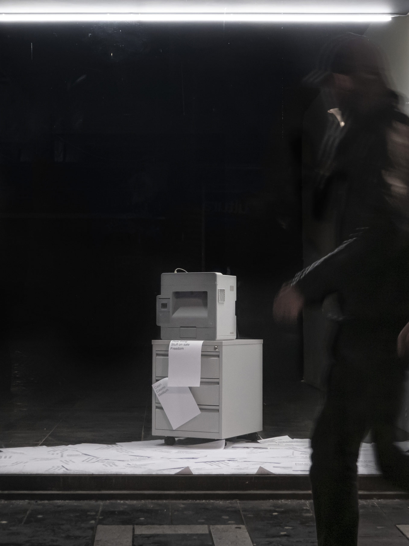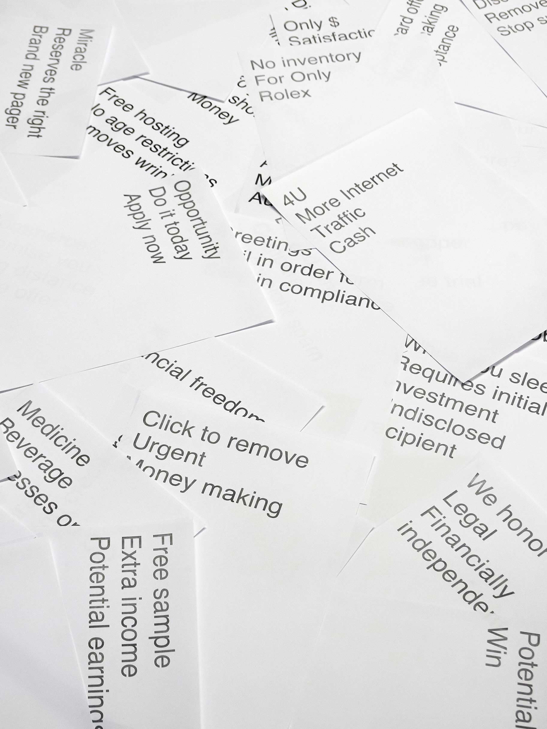 Une imprimante crache toutes les dix minutes un haïku généré aléatoirement à partir d’une longue liste de mots et d’expressions à ne pas utiliser dans vos e-mails pour éviter qu’ils ne se retrouvent dans les spams. Ces listes noires sont fourni par des agences de marketing digitales pour former leur client aux techniques de mailing. Un programme informatique choisit au hasard trois vers puis compose un court poème avec. Ces poèmes, sorti des poubelles d’internet, s’accumulent alors sur le sol pendant toute la durée de l’exposition.