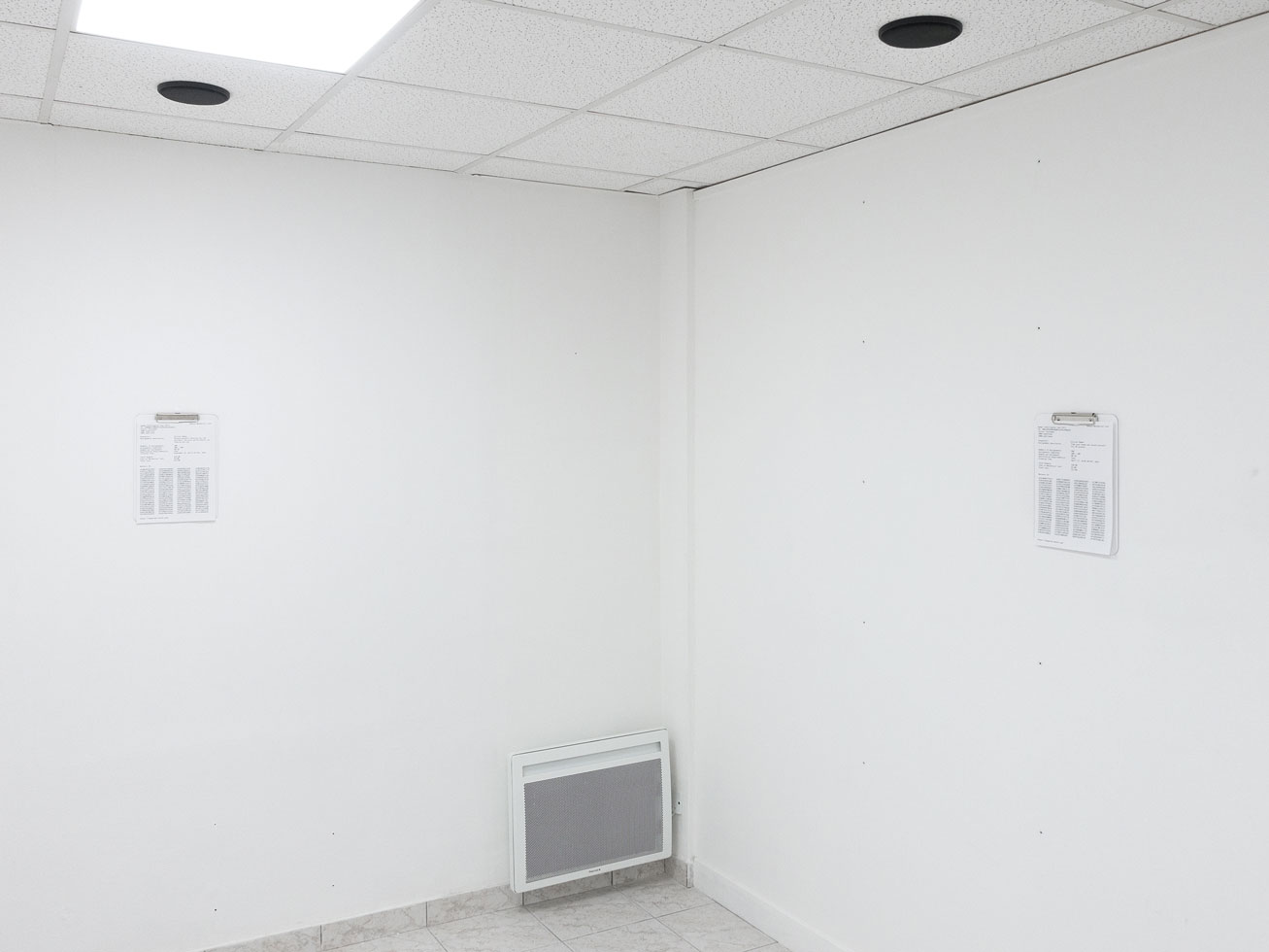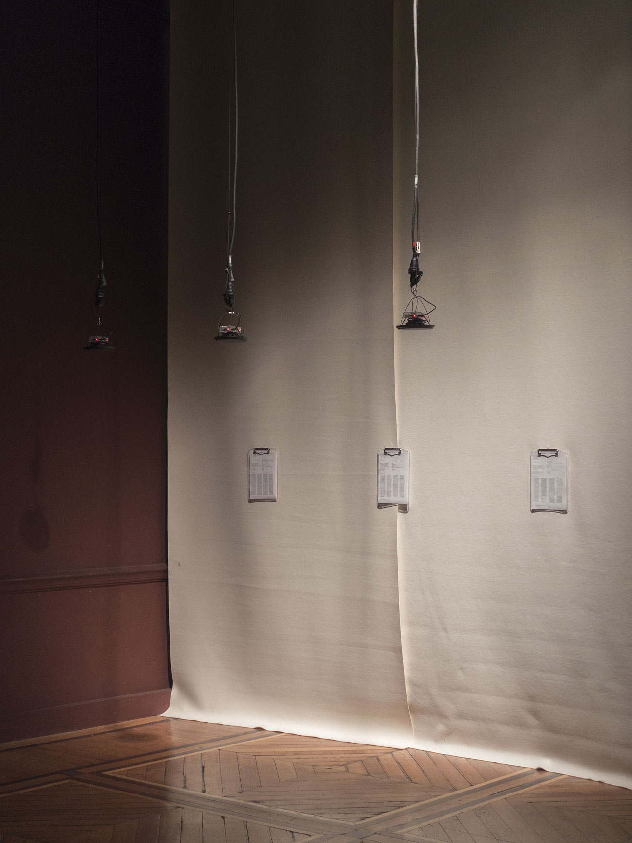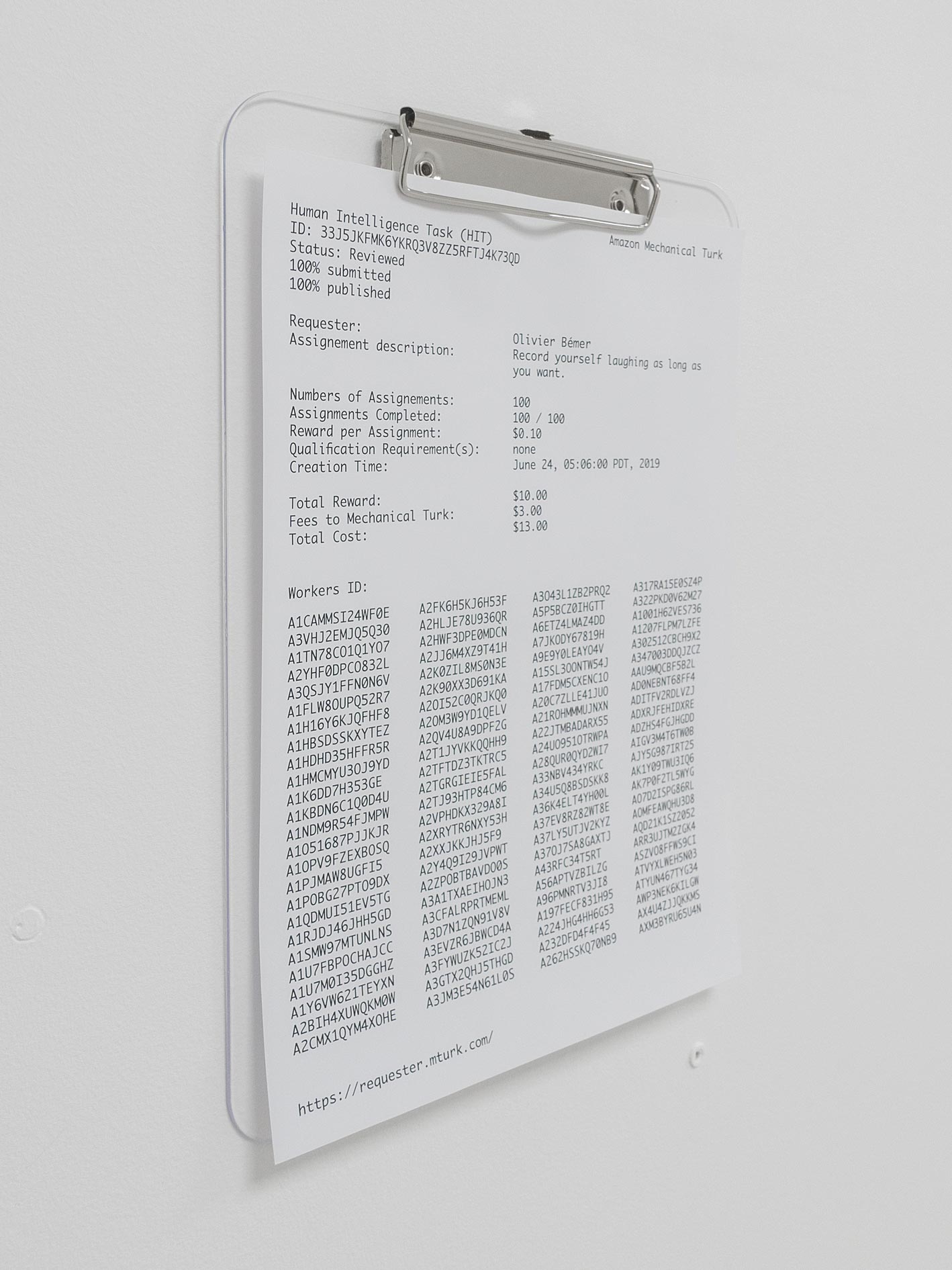 est une installation sonore simulant de manière aléatoire et continue trois types d’interactions sonores provenant normalement d’un groupe de personnes : un rire, un applaudissement et un mantra. Chaque interaction est constituée de 100 enregistrements réalisés par 100 personnes différentes, rémunérées 0,10 $ via le site Amazon Mechanical Turk, une plateforme lancée par amazon.com en 2005 pour embaucher à distance des « travailleurs de foule » chargés d’exécuter des micro-tâches que les ordinateurs ne peuvent pas encore accomplir. Les enregistrements sont ensuite diffusés simultanément mais aléatoirement pour simuler un enregistrement de groupe. Une diffusion dont la cohabitation de rythmes et de textures sonores hétérogènes témoigne d’un éclatement des participant·es et d’une impossibilité à faire groupe. Un relevé de chaque transaction financière est imprimé sur une feuille A4 et suspendu à un panneau pince sous chaque haut-parleur.