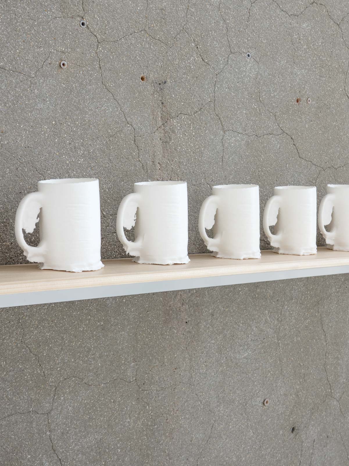 Un premier mug est scanné en trois dimensions afin de réaliser une copie numérique qui sera ensuite imprimée en 3D. Comme des photocopies, cette opération est répétée jusqu’à épuisement de la forme originale. Une sorte d’archéologie inversée où l’itération numérique dégrade autant qu’elle décline son sujet. Les copies physiques sont ensuite présentées comme des sculptures accompagnées d’une vidéo animée réalisée avec les copies numériques. Des personnages parlants sont placés sur les mugs, tentant de convaincre que leur mug est plus précieux que le précédent. Chaque reproduction cherche à s’individualiser artificiellement alors que la forme perd son lien avec son utilité.